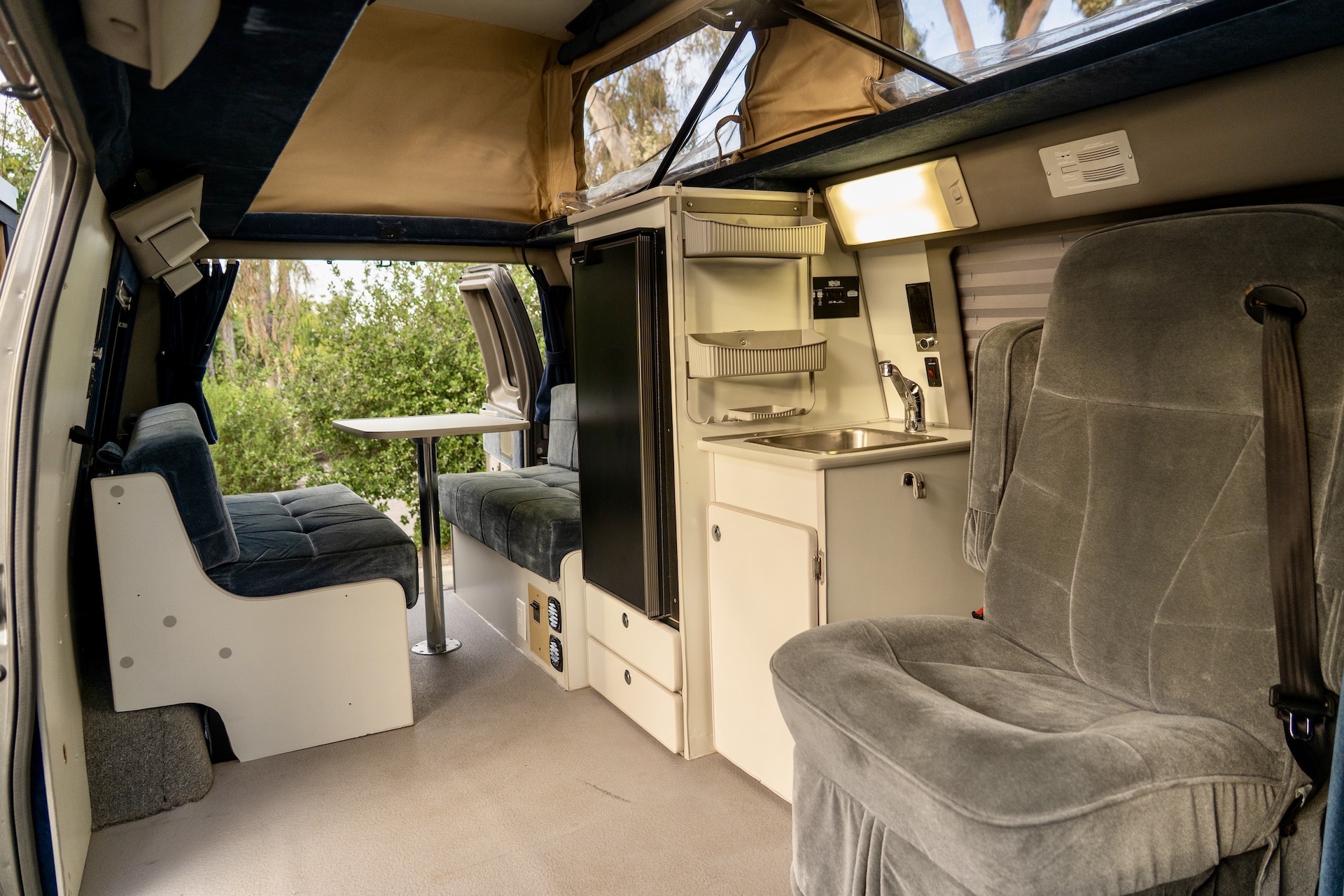 One of the standout features of this van is its flexibility. It seats up to 7 passengers with seatbelts and sleeps 4 people comfortably, making it ideal for families or group travel.