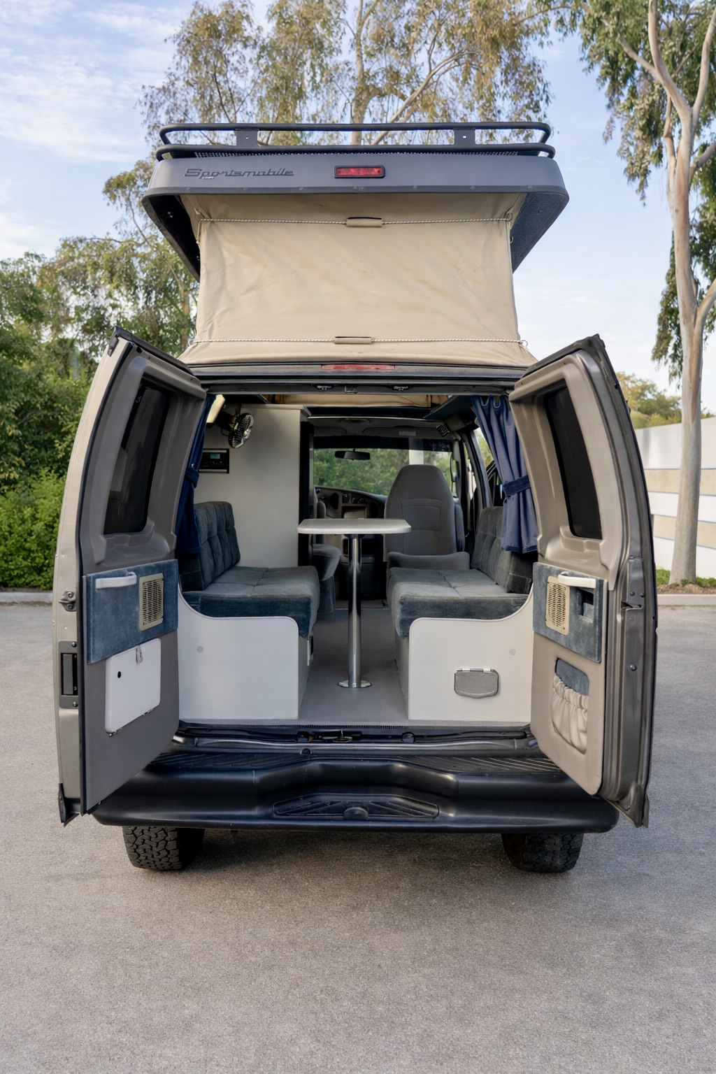 Sportsmobile pop-top roof with large upper sleeping area